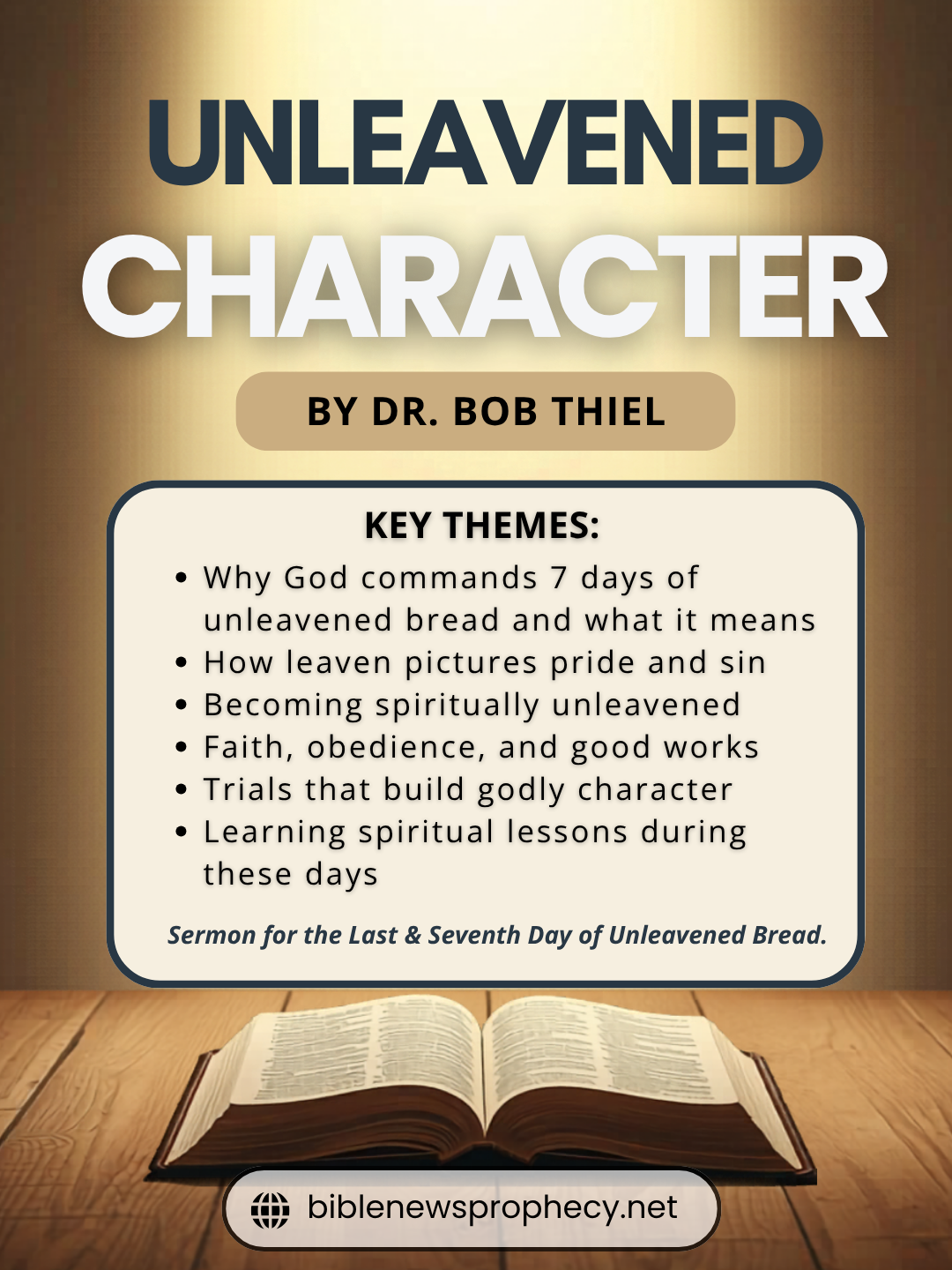 The word of God commands eating unleavened bread for seven days? Why might that be? Are Christians supposed to strive for perfection? Are God's commandments righteousness? If salvation is a free gift of God by faith, is obedience necessary? Is there a purpose in the tests, trials, and sufferings of this physical life? Did James write that faith without works is dead? Are Christians created for love and good works? Once our sins are forgiven, are we to strive to put sin completely out of our life? What is character? Do pride and leaven puff up? Are Christians to be spiritually unleavened? Are we to be God's offspring? Should we be learning lessons during the Days of Unleavened Bread? Dr. Thiel addresses these matters on a sermon intended for the Last & Seventh Day of Unleavened Bread.